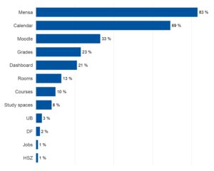 Gefragt nach den drei meistgenutzten Features der RWTHapp nennen 83 Prozent die Mensa und 69 Prozent den Kalender. Danach folgen mit weitem Abstand RWTHmoodle (33 %), die Noten (23 %) und die Startseite (21 %). Ob die wenig genannten Features gar nicht genutzt werden oder nur nicht zu den drei meistgenutzten Features der Teilnehmenden gehören, können die Daten nicht beantworten.